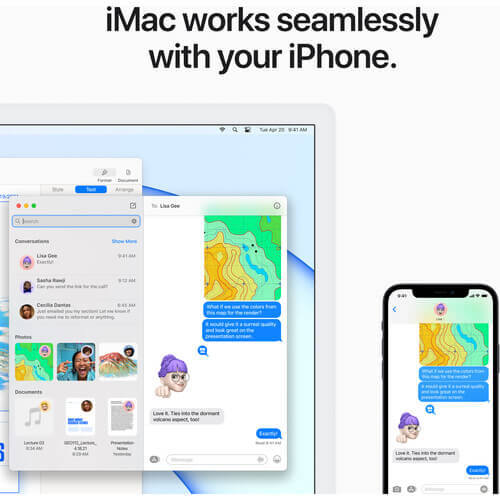El M1 es el chip más potente que hemos creado y macOS Big Sur es el sistema operativo de ordenador más avanzado del mundo. Juntos convierten al iMac en un prodigio del rendimiento, la eficiencia y la seguridad. Se despierta al segundo, las apps se abren inmediatamente y todo funciona como la seda. La CPU es hasta un 85 % más potente y la velocidad gráfica llega a duplicar la del iMac estándar de 21,5 pulgadas. Por eso podrás usar apps como Xcode y Affinity Photo para compilar código al vuelo o editar fotos en tiempo real.3 Este iMac es ultrasilencioso y no se calienta aunque trabaje como una máquina. Es lo que pasa cuando el hardware, el software y el chip se diseñan juntos.